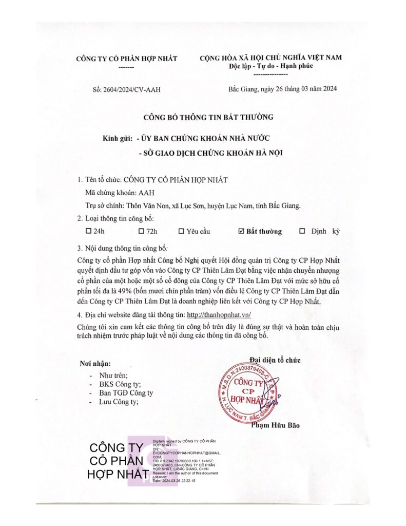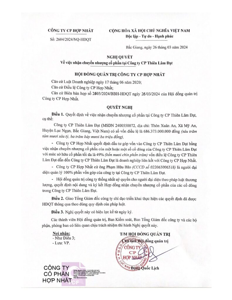 Công ty Cổ phần Hợp Nhất công bố Nghị quyết về việc đầu tư góp vốn vào CTCP Thiên Lâm Đạt (CTCP Thiên Lâm Đạt thành Doanh nghiệp liên kết với CTCP Hợp Nhất)