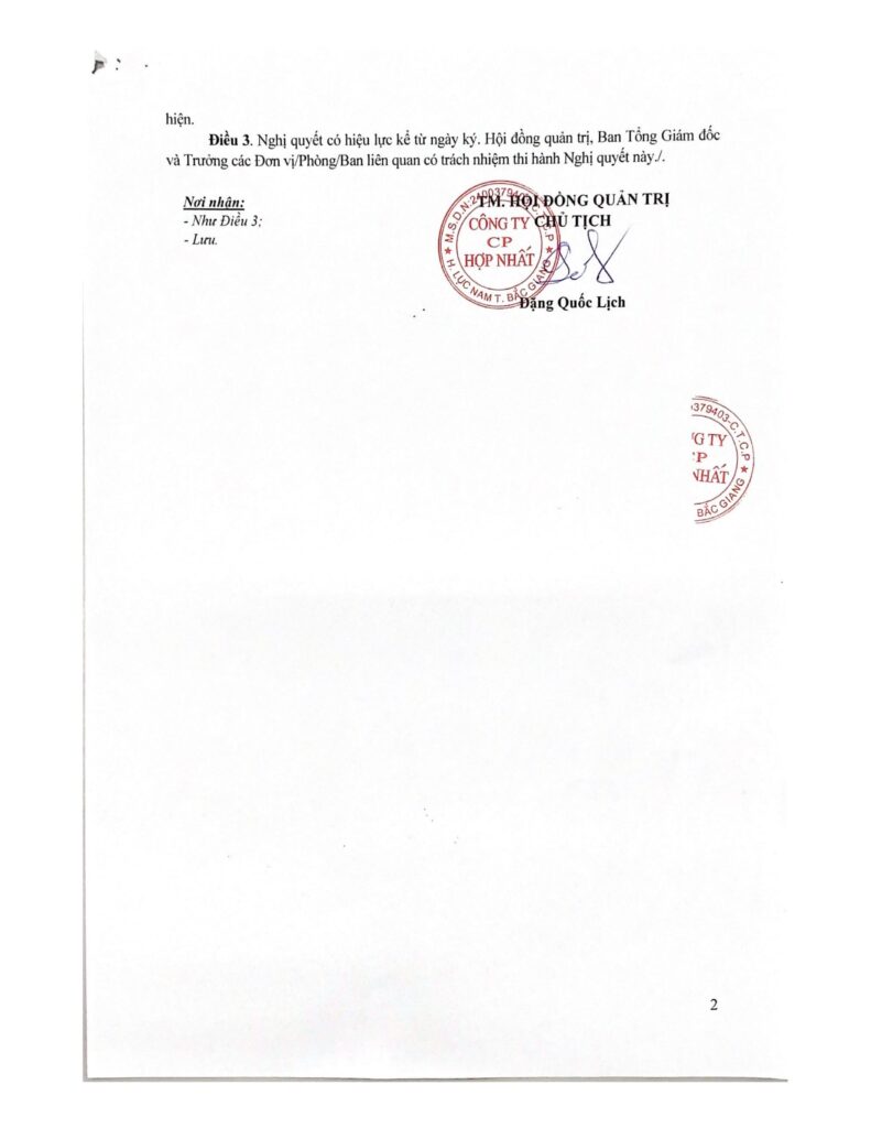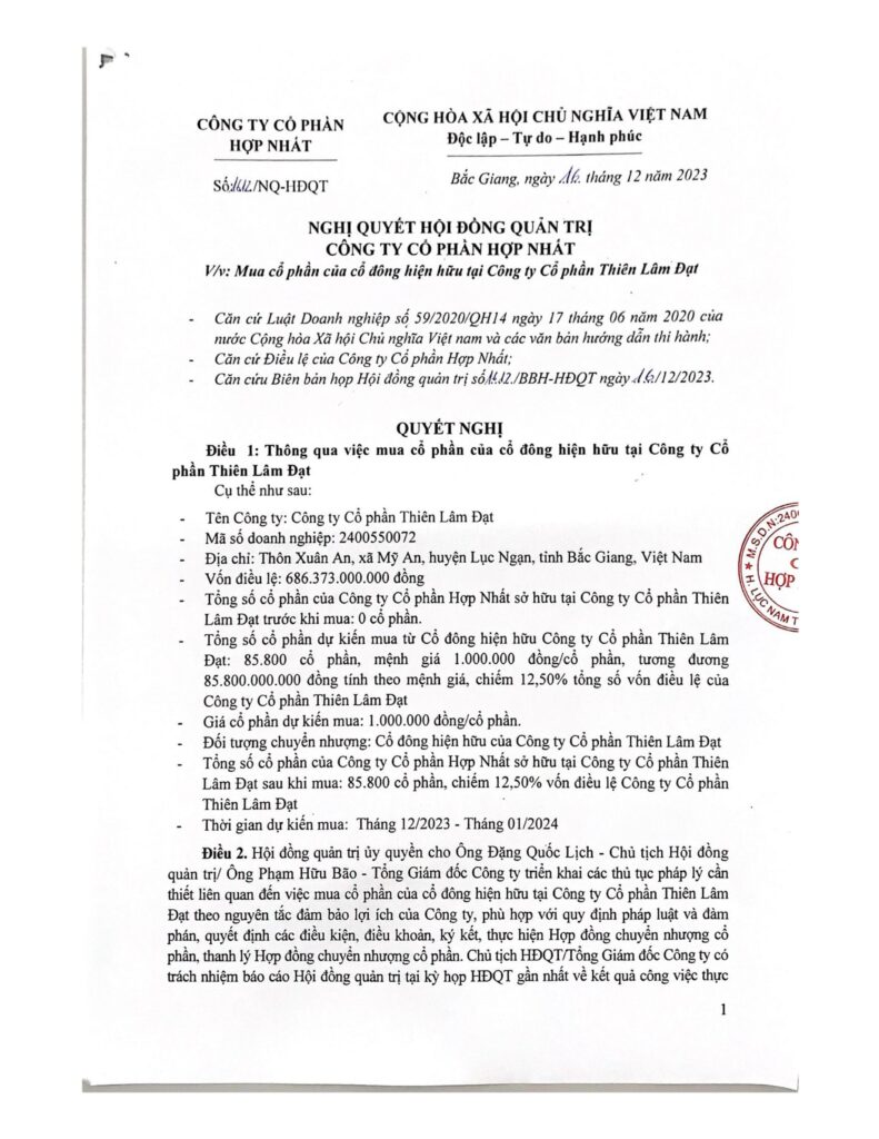 Ngày 16/12/2023 Hội đồng Quản trị Công ty Cổ phần Hợp Nhất thông qua Nghị quyết, quyết định mua Cổ phần của cổ đông hiện hữu tại Công ty Cổ phần Thiên Lâm Đạt. Nội dung cụ thể như sau: