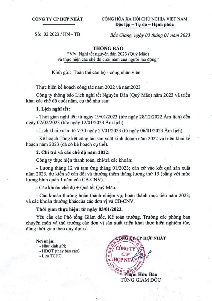 Tin tức Thông báo Lịch nghỉ tết nguyên đán 2023 (Quý Mão) 11 Th1 Bài viết liên quan Phê duyệt Nhiệm vụ lập Điều chỉnh Quy hoạch năng lượng quốc gia CBTT: BÁO CÁO TÀI CHÍNH QUÝ III NĂM 2025 Kỷ niệm 80 năm quốc khánh 02/09/1945 – 02/09/2025 THÔNG TIN ĐỊNH KỲ BÁO CÁO TÀI CHÍNH TỪ 01/01/2025 ĐẾN 30/06/2025 CBTT: BÁO CÁO TÀI CHÍNH QUÝ 2 NĂM 2025 Chỉ thị của Tổng Giám đốc về việc phòng chống cơn bão số 3 (WIPHA) năm 2025 CBTT: về Hợp đồng soát xét BCTC kỳ tài chính 6 tháng đầu năm; Kiểm toán BCTC kết thúc 31/12/2025 của CTCP Hợp Nhất CBTT: BÁO CÁO TÀI CHÍNH QUÝ 2 NĂM 2025